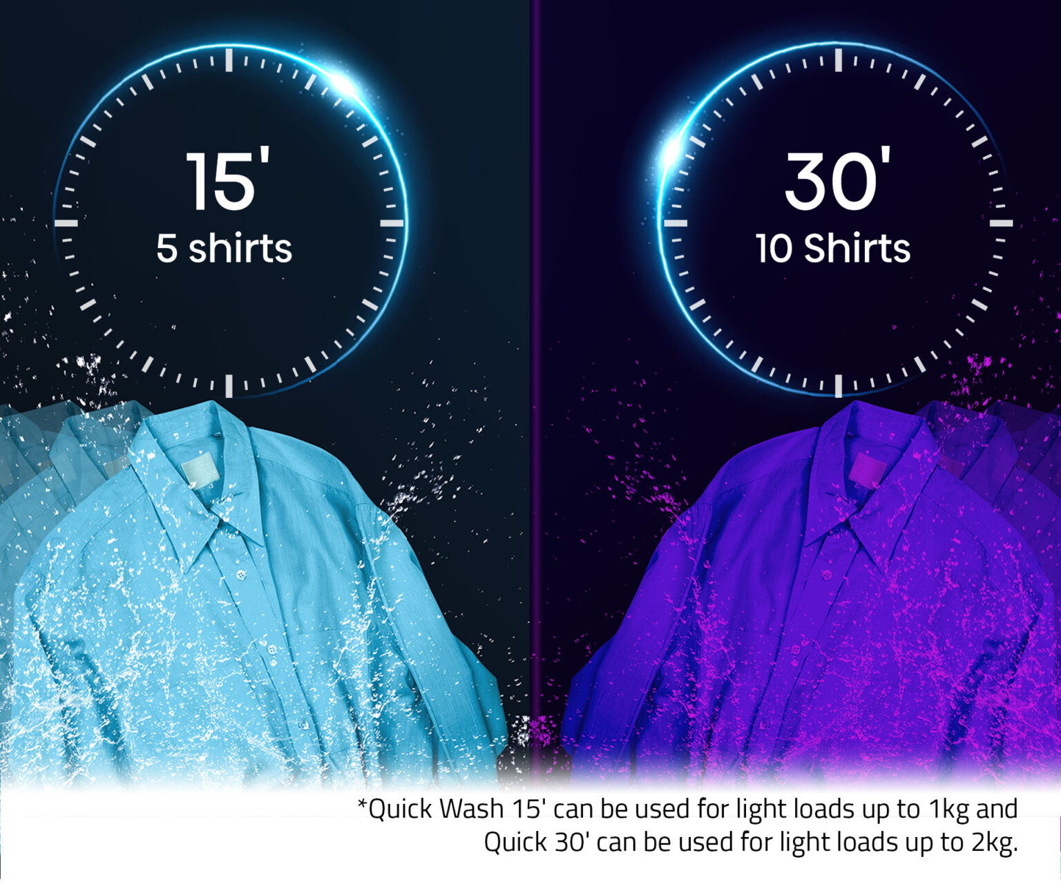 - Light loads washed quick! – Utilise Quick 15’ for light loads up to 1kg or Quick 30’ for light loads up to 2kg for those times when you need wash clothes quickly.
