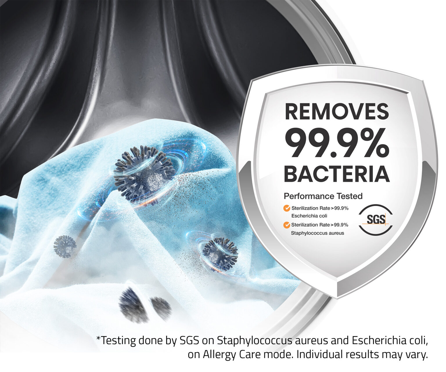 - Steam Function – With this function high-temperature steam is released from the bottom of the drum, permeating your clothing, eliminating 99.9% of allergens and other microbes.